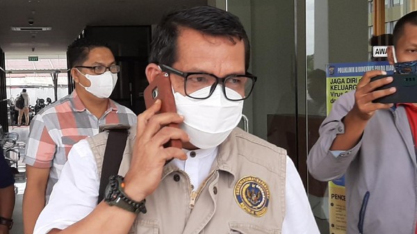 Syafri keluar sambil menenteng tas hitam. Dia terlihat sedang bicara melalui ponselnya dan tak mau menjawab pertanyaan soal materi pemeriksaannya.
