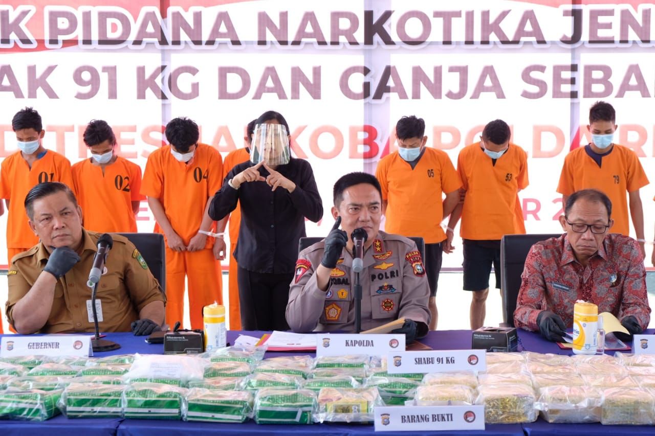 Tak tanggung-tanggung narkoba jenis sabu seberat 91 kilogram dan 25 kilogram daun ganja kering berhasil diungkap di tiga lokasi penangkapan.