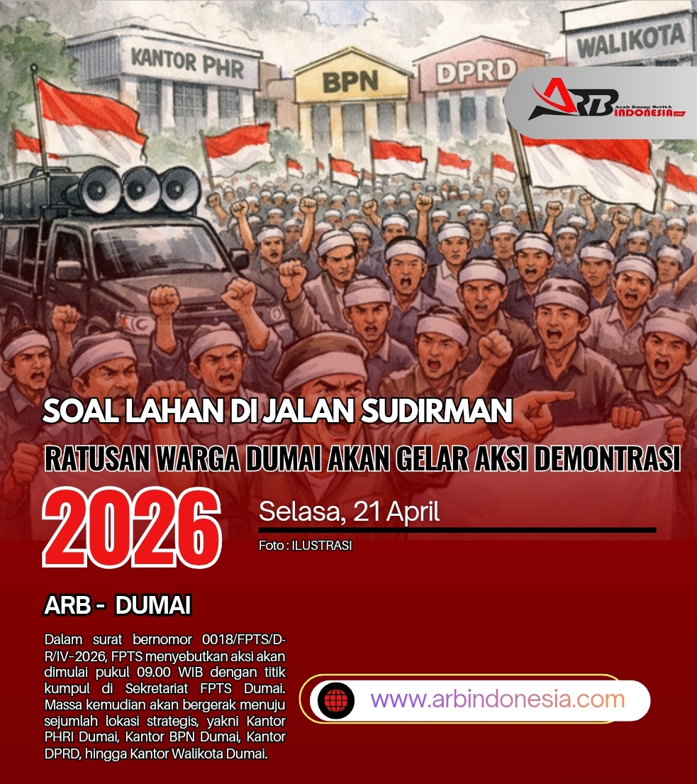 ARBindonesia.com, DUMAI – Forum Pejuang Tanah Sudirman (FPTS) Kota Dumai resmi melayangkan surat pemberitahuan kepada Kepolisian Resor Dumai terkait rencana aksi demonstrasi yang akan digelar pada Rabu, 22 April 2026.