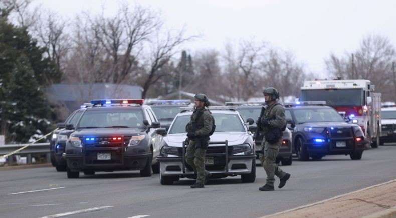 Siaran televisi menunjukkan, polisi membawa seorang pria menjauh dari tempat kejadian yakni Supermarket King Soopers dengan tangan diborgol, bertelanjang dada, serta berlumuran darah.