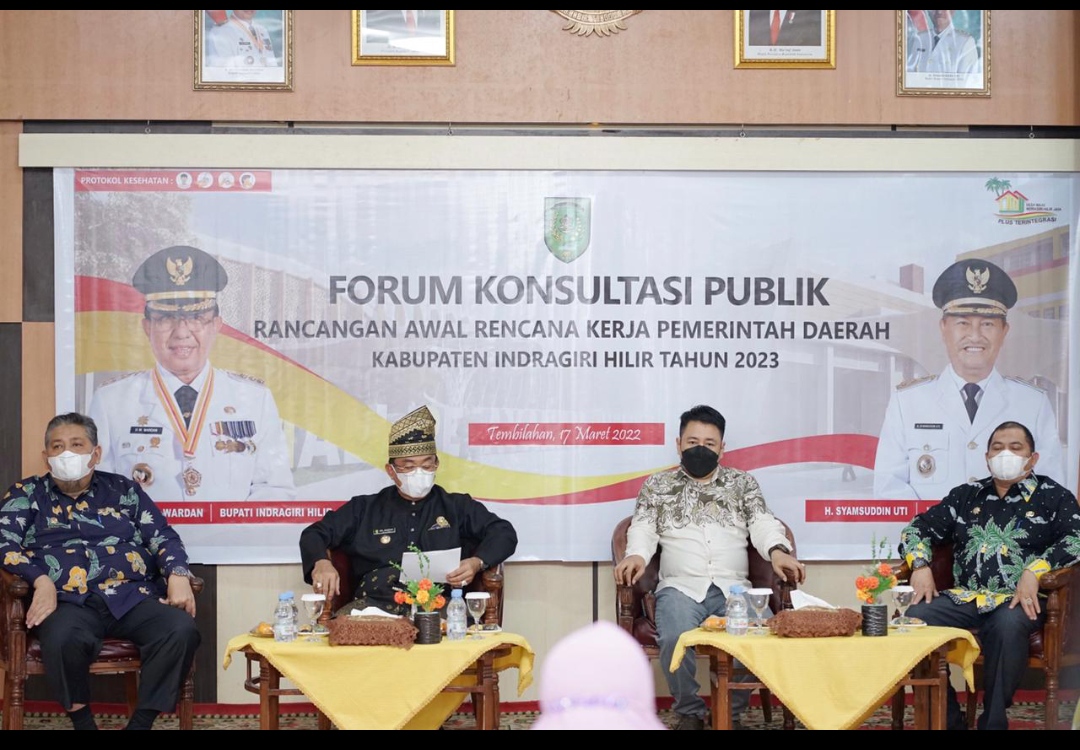 ARB INdonesia, INDRAGIRI HILIR – Bupati Indragiri Hilir (Inhil) HM Wardan membuka secara langsung Forum Konsultasi Publik Rancangan Awal Rencana Kerja Pemerintah Kabupaten Indragiri Hilir tahun 2023, di aula Kantor Badan Perencanaan Pembangunan Daerah (Bappeda), Jalan Akasia Tembilahan, Kamis 17 Maret 2022.