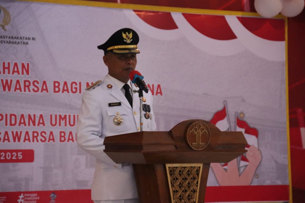 ARB INdonesia, INDRAGIRI HILIR – Bupati Indragiri Hilir (Inhil) Herman menyampaikan sambutan pada acara pemberian remisi umum dan pengurangan masa pidana bagi narapidana serta anak binaan, yang digelar dalam rangka Hari Ulang Tahun (HUT) ke-80 Kemerdekaan Republik Indonesia di Lembaga Pemasyarakatan Kelas IIA Tembilahan, Minggu (17/8/2025).