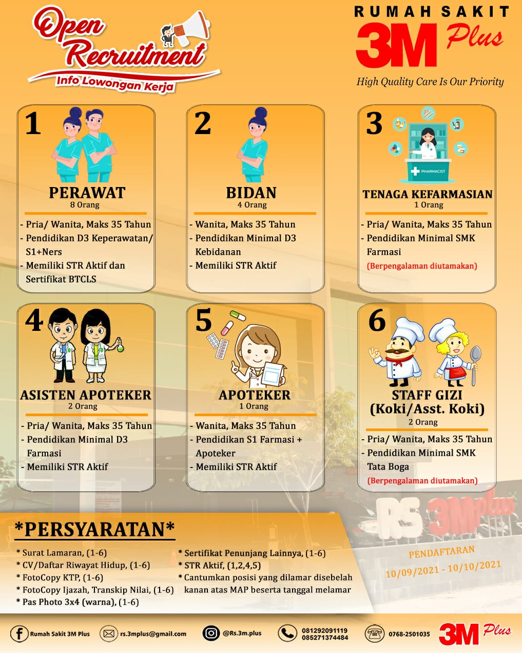 Kali ini RS 3M membutuhkan 8 orang untuk bagian Perawat, 4 Bidan, 1 orang tenaga kefarmasian, 4 Asisten Apoteker, 1 orang Apoteker, dan 2 orang Koki atau asisten Koki.