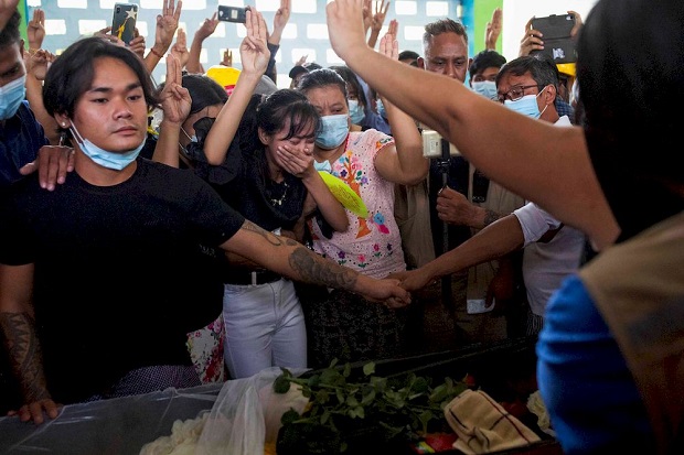 Orang-orang menghadiri pemakaman Chit Min Thu, yang meninggal dalam protes anti-kudeta di North Dagon, Yangon, Myanmar, 13 Maret 2021. Foto/REUTERS