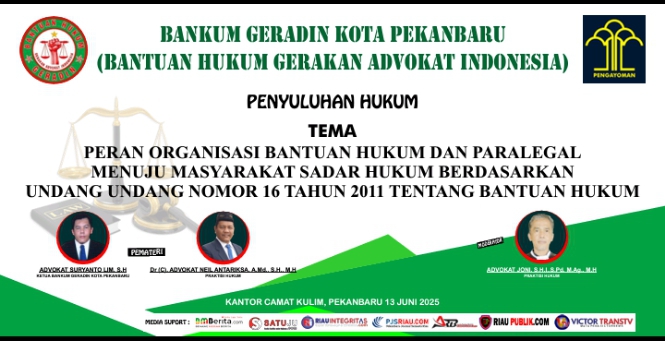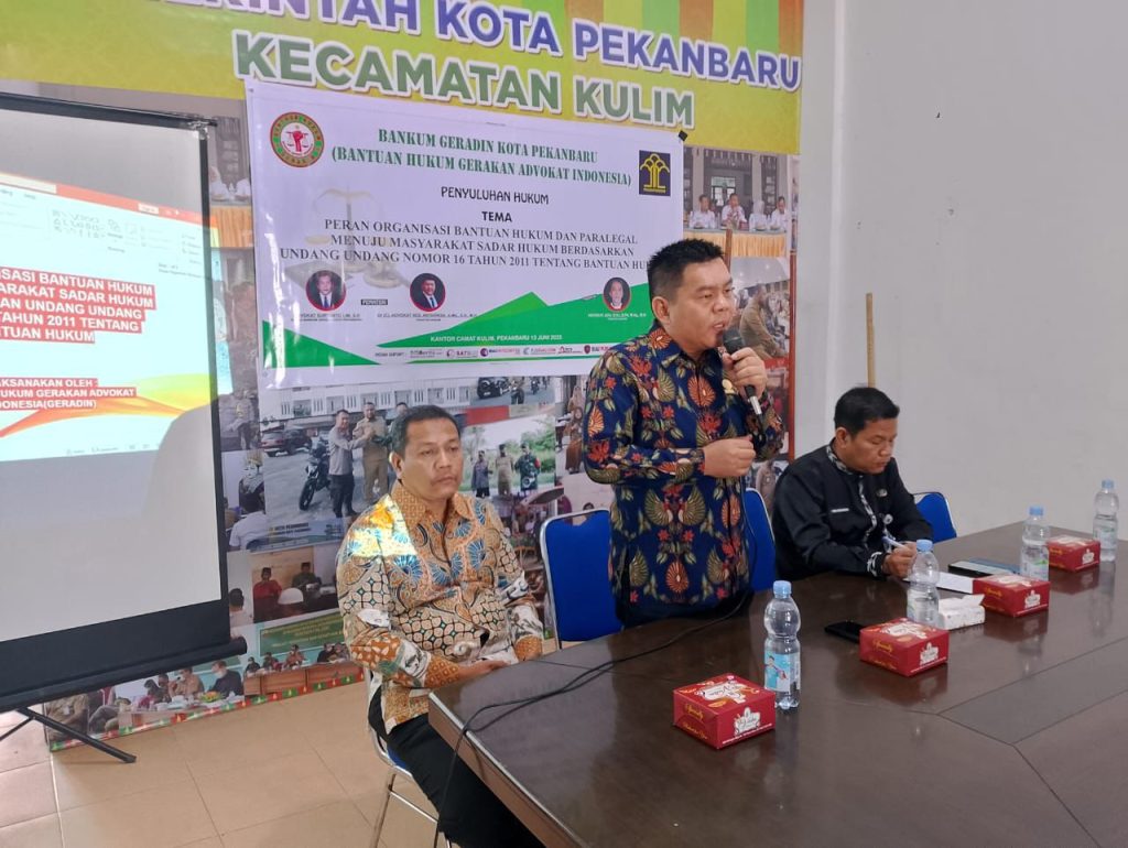 ARB INdonesia, PEKANBARU – Mengangkat tema peran bantuan hukum dan paralegal menuju masyarakat sadar hukum berdasarkan undang undang nomor 16 tahun 2011 tentang bantuan hukum, Bankum Geradin (Bantuan Hukum Gerakan Advokat Indonesia) Kota Pekanbaru gelar penyuluhan hukum yang diselenggarakan di aula kantor Kecamatan kulim, Jumat pagi (13/6/25).