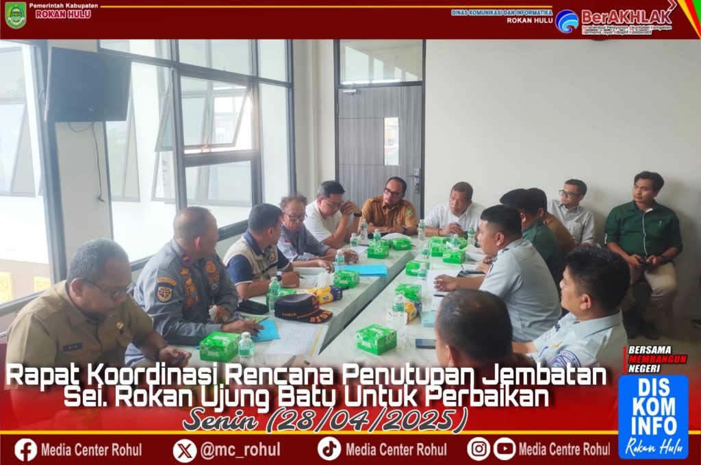 ARB INdonesia, ROKAN HULU – Pemerintah Provinsi Riau melalui Kepala Dinas Perhubungan Provinsi Riau Andi Yanto, S.H. M.H lakukan Rapat Koordinasi (Rakor) rencana penutupan jembatan sungai Rokan dalam rangka perbaikan dan pemeliharaan jembatan. Ujung Batu, Senin (28/04/2025).