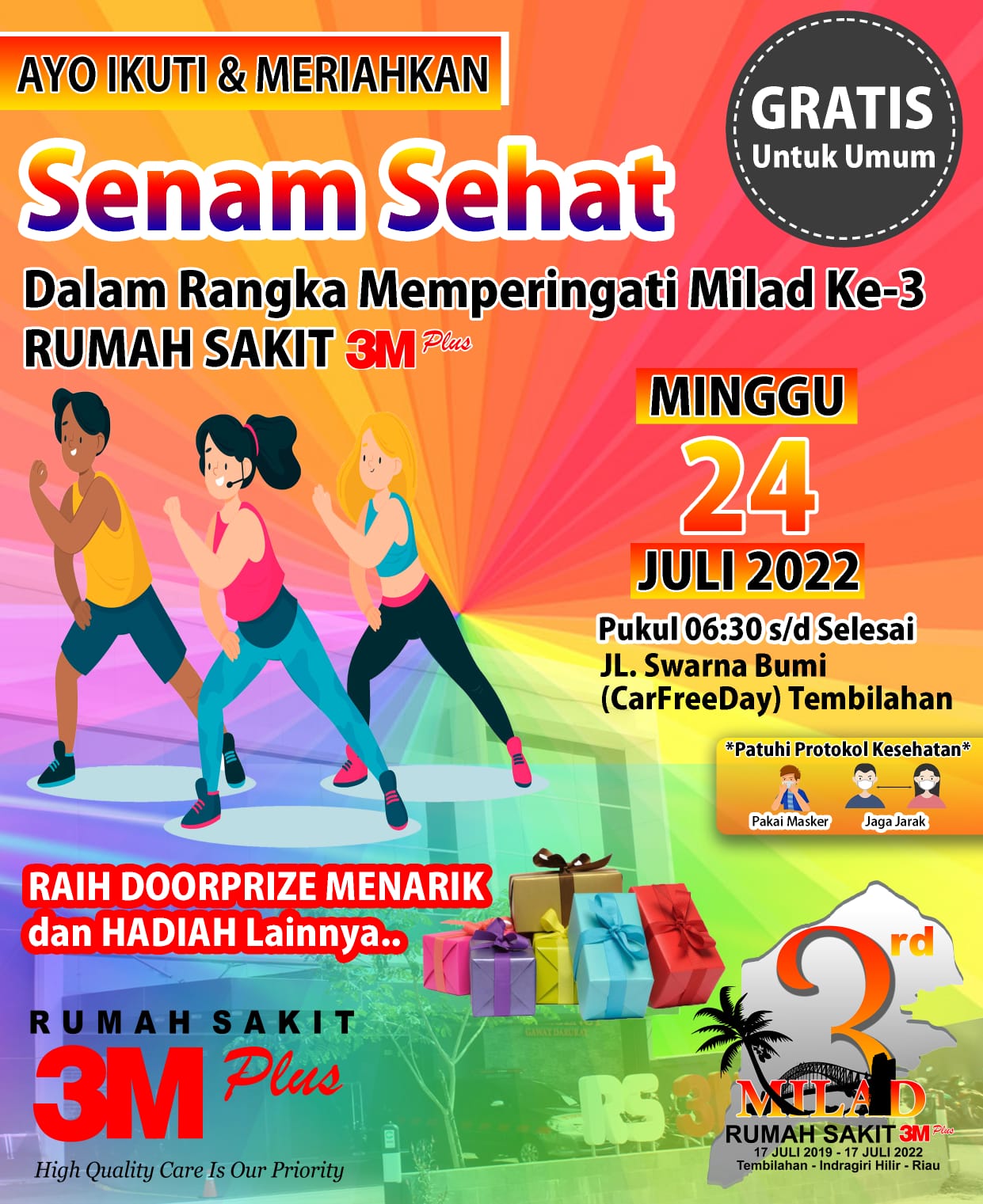 “Ayo ikuti Senam Sehat dalam rangka memperingati milad ke-3 RS 3M Plus Tembilahan, dan raih doorprize menarik dan hadiah lainnya,” ajak Dimas, Selasa (19/7/2022).