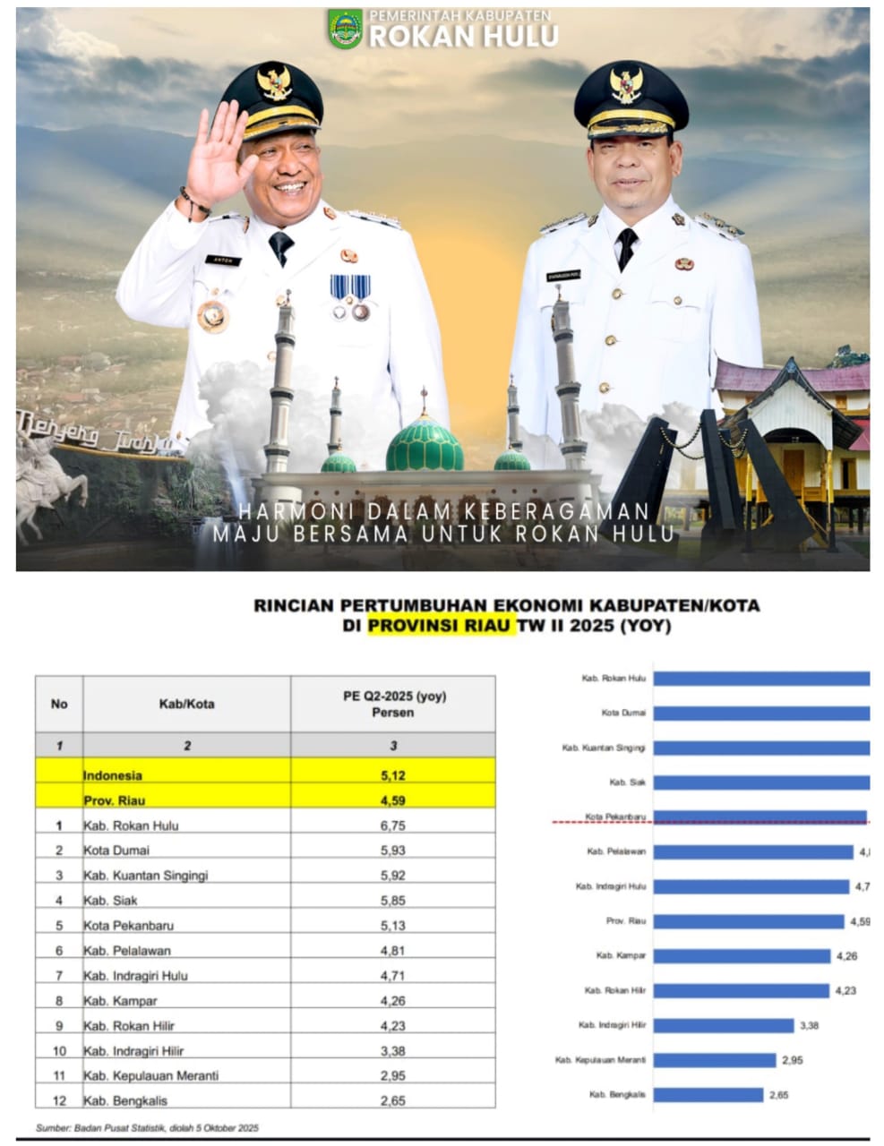 Angka tersebut tertuang dalam rincian Pertumbuhan Ekonomi Kabupaten/Kota se-Provinsi Riau Triwulan II (Year on Year), di mana capaian Rokan Hulu melampaui rata-rata provinsi yang berada di angka 4,59 persen dan juga di atas rata-rata nasional sebesar 5,13 persen.