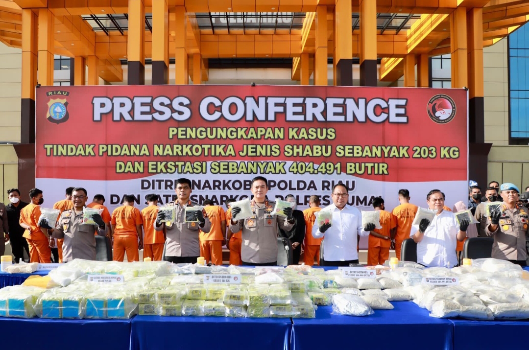 “Tergelar barang bukti sabu 203 kg dan 404.491 butir ekstasi yang berhasil kita sita dari kasus penyalanggunaan tindak pidana narkoba. 203 kg sabu ini terdiri dari kasus TKP pertama yaitu di Taman Karya Pekanbaru, kita melaksanakan upaya paksa tentunya melalui proses penyelidikan. Tim Ditresnarkoba bekerja sama dengan Dit Intelkam berhasil mengungkap 100.000 butir ekstasi dan 100 kg sabu dengan 10 tersangka yang ada di belakang saya ini pada hari Minggu 11 september 2022,” terangnya.