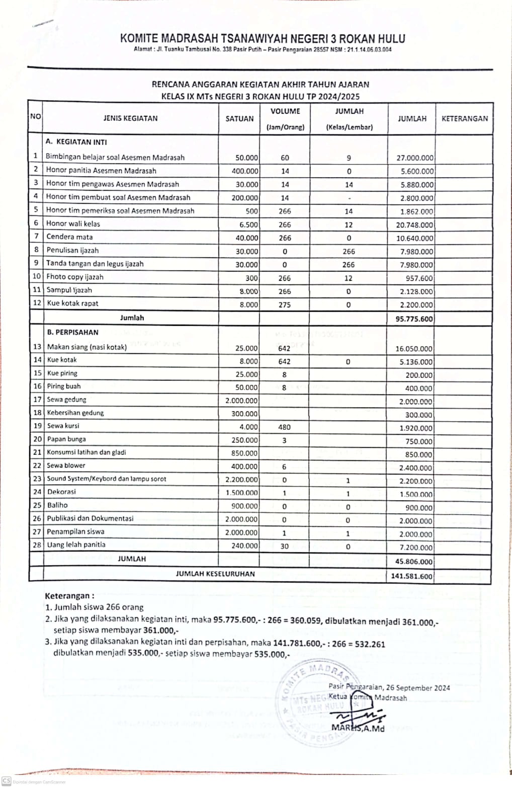 Rencana anggaran kegiatan akhir tahun ajaran kelas IX MTs N 3 Rokan Hulu TP 2024/2025.