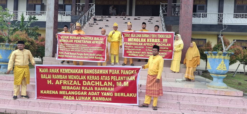 ARB INdonesia, ROKAN HULU – Tiga Kubu Dzuriyat Bangsawan di Luhak Rambah menyatakan menolak rencana pentahkikan dan penakbalan Afrizal Dahlan sebagai Raja Luhak Rambah, Sabtu (4/10/2025). Mereka menilai proses yang berjalan belum sesuai tradisi Puak Rumah Pangka Balai, terutama syarat “masuk Puak” yang harus ditempuh di hadapan anak-kemenakan Puak berikut pemenuhan syarat/hutang adat.