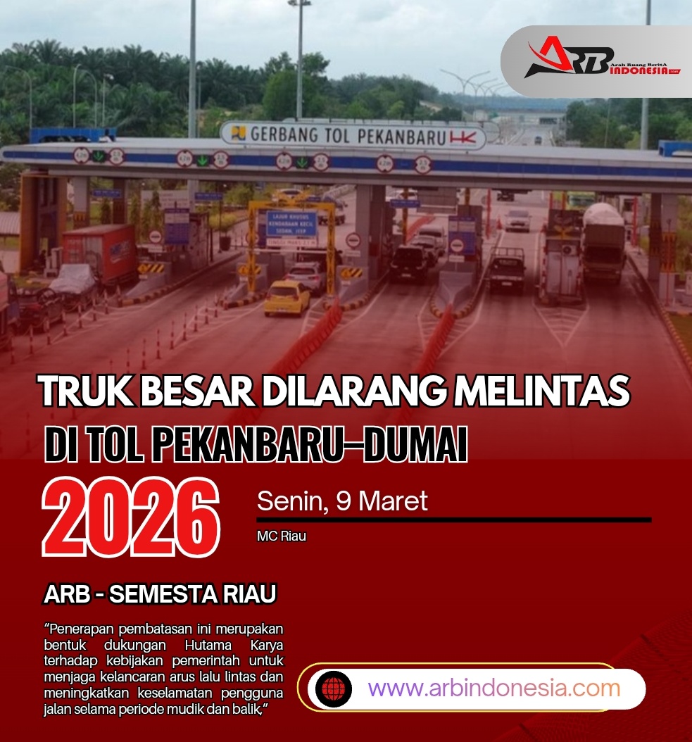 ARBindonesia.com, PEKANBARU – PT Hutama Karya (Persero) akan menerapkan pembatasan operasional angkutan barang di sejumlah ruas Jalan Tol Trans Sumatera (JTTS) selama periode arus mudik dan arus balik Lebaran 2026. Salah satu ruas yang terdampak kebijakan tersebut adalah Tol Pekanbaru–Dumai, yang menjadi jalur penting mobilitas masyarakat di Provinsi Riau.